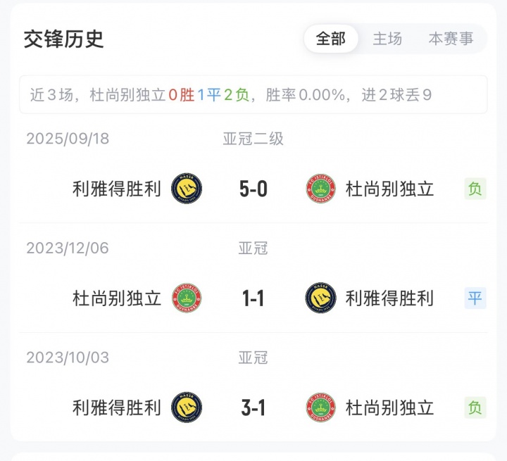 本场赛前,亚冠二级小组赛D组,利雅得胜利4胜0平0负积12分,排名第1,杜尚别独立2胜0平2负积6分,排名第3。